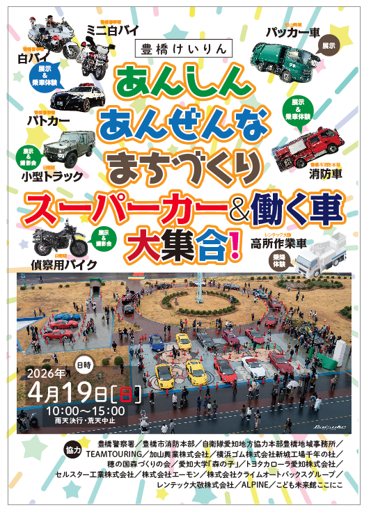豊橋競輪場のイベント「あんしんあんぜんなまちづくり~スーパーカー&働く車 大集合!」に、新城の間伐材を使ったプレートづくりで参加します。ご来場をお待ちしております。